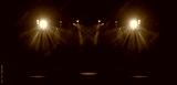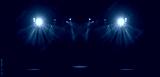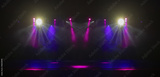 An empty stage of the theater, lit by spotlights and smoke before the performance