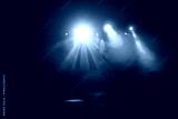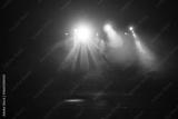 An empty stage of the theater, lit by spotlights and smoke before the performance