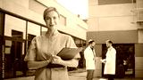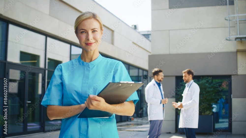 Caucasian female nurse standing outside clinic. Professional holding clipboard confidently. Medical worker focusing on camera. Background doctors engaging in discussion near hospital building.