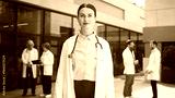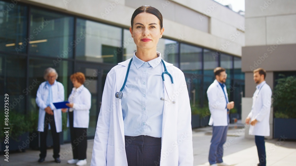 Caucasian female doctor standing outside hospital. Professional crossing arms confidently. Medical specialist focusing on camera. Background colleagues reviewing documents near clinic building.