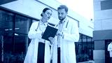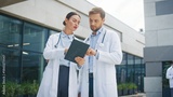 Caucasian doctors standing outside clinic. Female specialist holding tablet listening to colleague pointing at data. Medical team evaluating complications. Discussion unfolding near hospital.