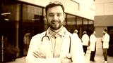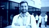 Handsome Caucasian male doctor standing confidently. Arms crossed while smiling calmly. Medical team interacting in background. Scene unfolding outside rehabilitation center. Stethoscope around neck.