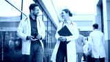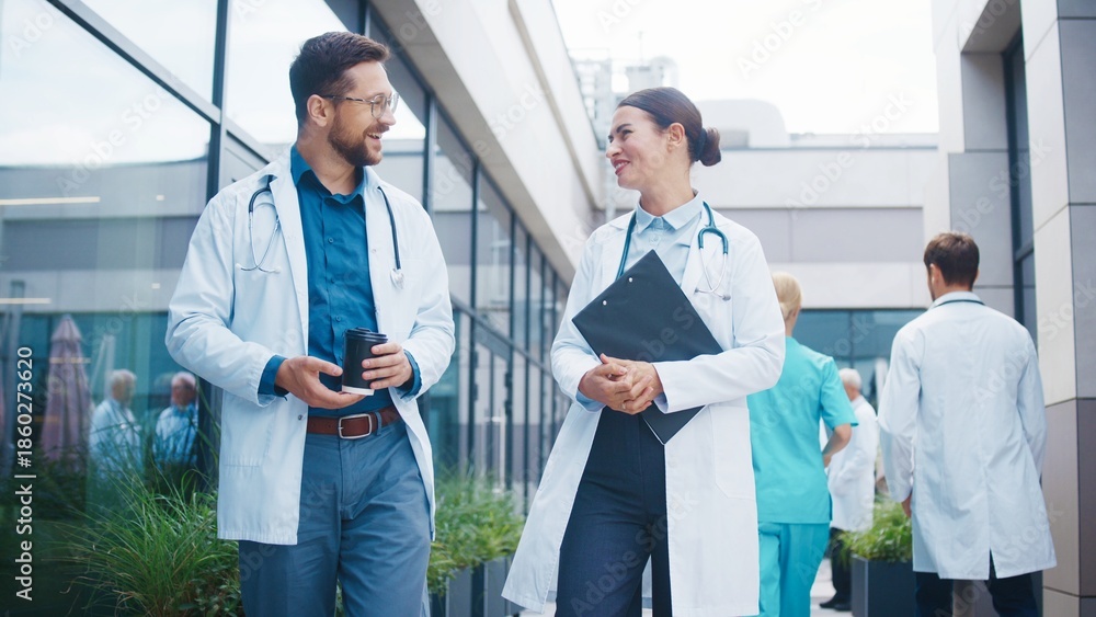Charming male doctor holding coffee and walking beside smiling female colleague outside clinic. Positive team sharing thoughts while moving together. Professionals discussing tasks during calm moment.
