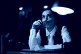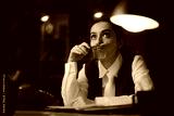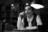 Woman Playing with her Pen Feeling Demotivated art Work. Silly office buffoon lady procrastinating instead of working