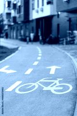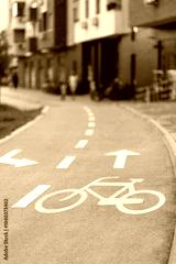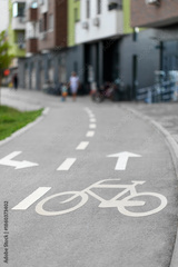 Close-up of a bicycle lane marking with arrows and dashed line, blurred residential building and people in background.
