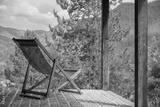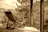 Deck chair on a stone patio overlooking a vast forest and mountain landscape on a sunny day.