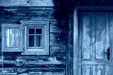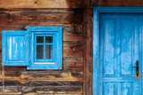 Rustic wooden wall with an open-shuttered window and a door, all painted in a vivid, weathered blue.