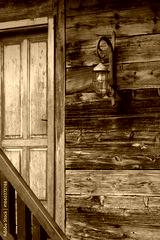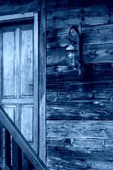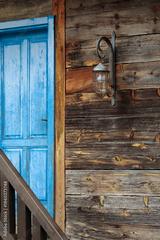 Weathered blue door and vintage caged lantern on a rustic log and wood plank house facade with a wooden railing.