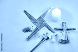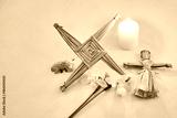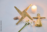 Brigid's cross, corn dolly and candle celebrating imbolc