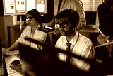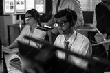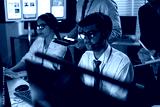 Professional call center operators work in a modern tech office. Team agent in headset monitors digital data while a supervisor provides technical guidance. Cybersecurity, network safety, and digital