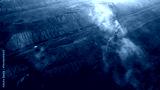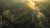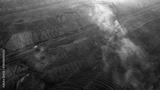 Aerial view of an active coal mining site showcases heavy machinery and smoke billowing into the air