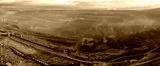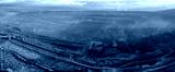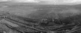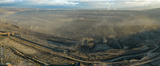 Aerial view of an active coal mining site showcases heavy machinery and smoke billowing into the air