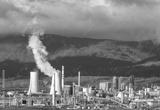 Aerial view of chemical plant. Smoking chimneys from factory. Chimneys of big factory polluting environment