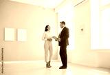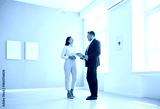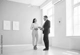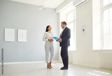 Portrait of young happy man professional realtor standing with young woman client in modern new apartment discussing contract buying property. Move, rent and real estate market concept.
