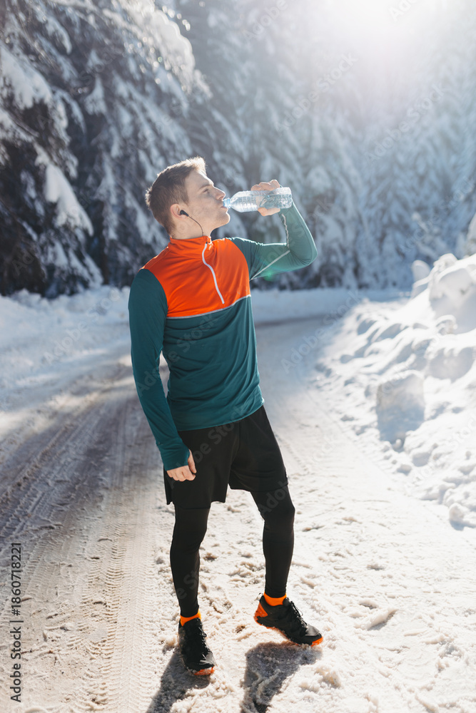 Male runner drinking water before a winter run in the snow