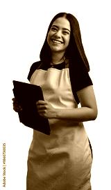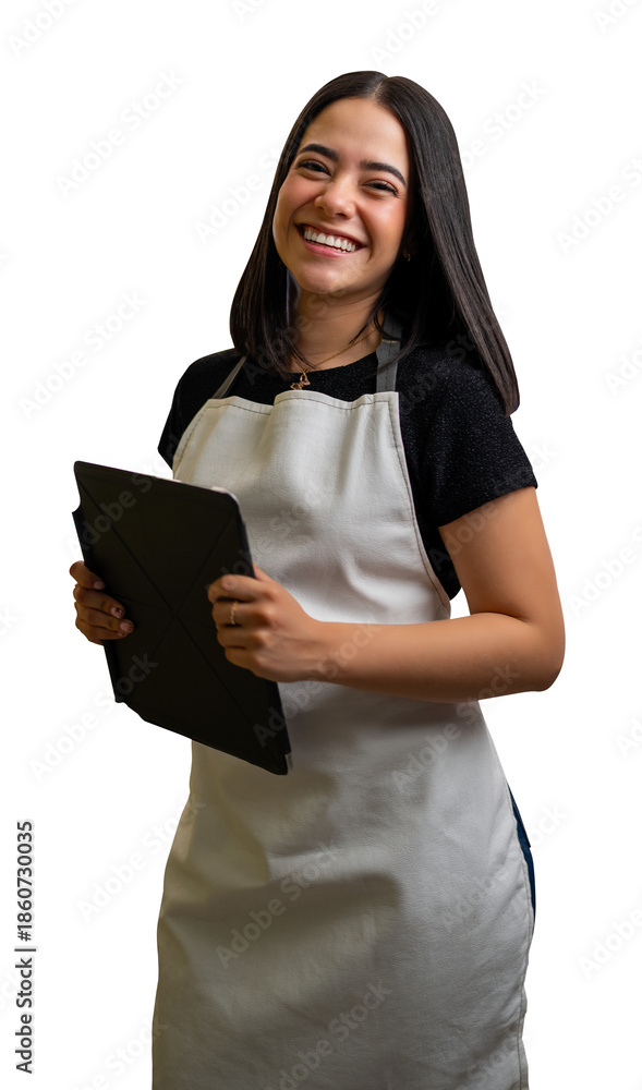 Smiling latina woman wearing apron holding a digital tablet for customer service