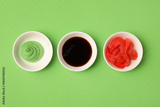 Bowls with wasabi, soy sauce and pickled ginger on green background