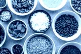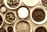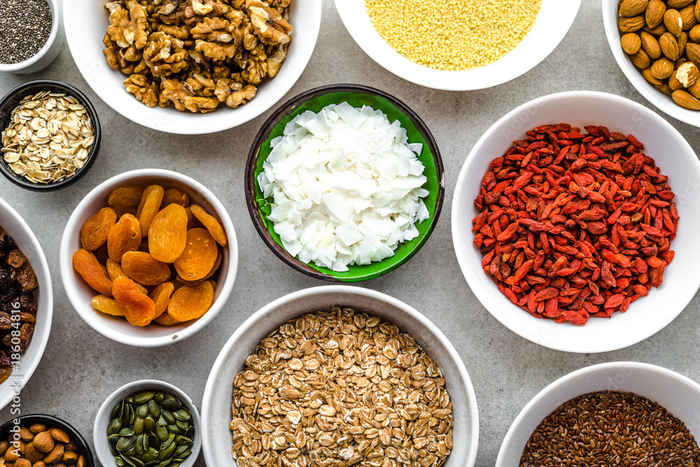 Vegetarian breakfast with healthy food selection, nuts, seeds, goji berries and other superfoods on table, flat lay, overhead