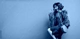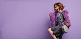 Stunning barefooted woman in trendy fur coat dancing and laughing on photoshoot. Indoor photo of lovely girl with short hairstyle fooling around on purple background.