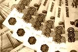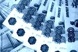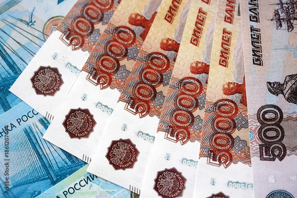 Russian ruble money bills banknotes lies in big pile on table close up. Concept of finances and business in Russian Federation