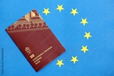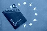 Swedish biometrical passport on European Union flag background. Concept of citizenship of Sweden