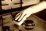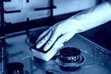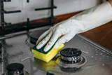 Person wearing rubber gloves is cleaning a stainless steel gas stove with a sponge, showcasing the importance of kitchen hygiene and maintenance in a domestic environment
