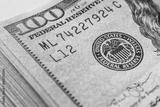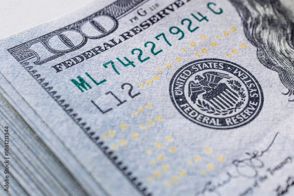 Close-up of a stack of hundred-dollar bills, showcasing intricate details of the currency, including serial numbers and the Federal Reserve emblem, representing wealth and finance