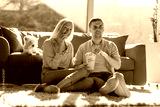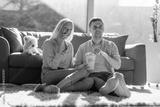 Couple sitting on a carpet and enjoying popcorn