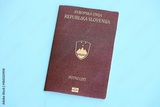 Slovenia passport on light blue paper background close up. Citizenship and travel in Europe concept