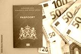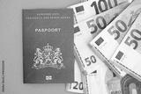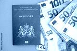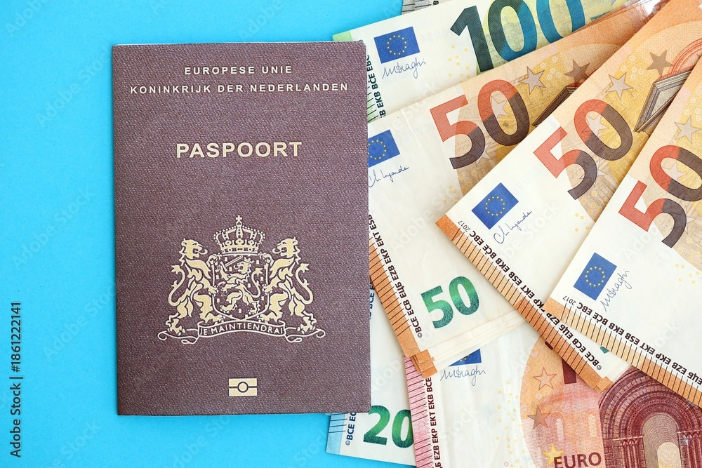 Netherlands passport lies with euro money banknotes on blue background close up. Salary and pension in Europe concept