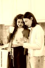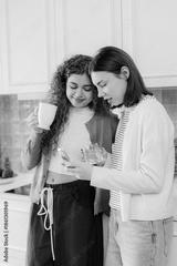 Two friends stand close in a warm kitchen, sharing a light moment. One sips coffee, while the other checks her phone. Laughter fills the air as they savor their time together.