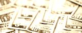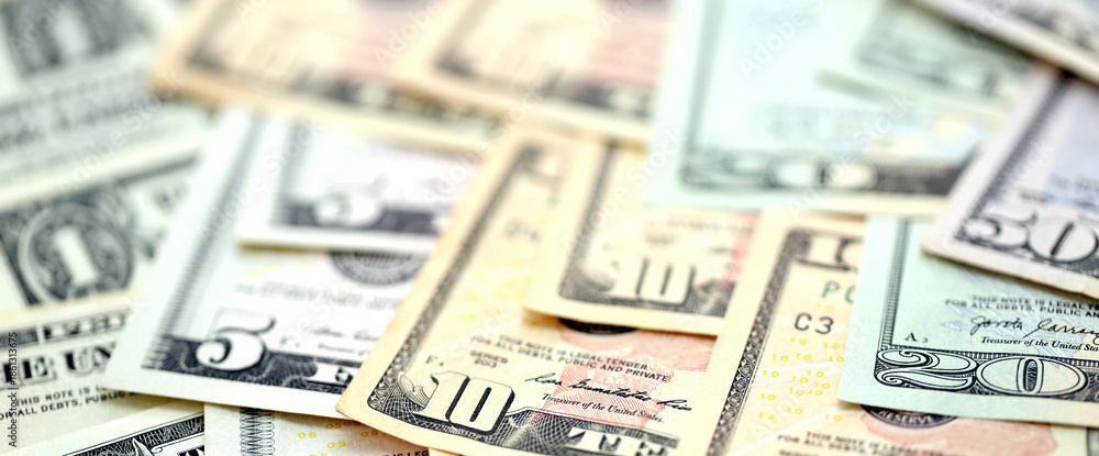 United States Dollar currency money bills. USD currency banknotes in pile with different denomination close up