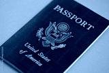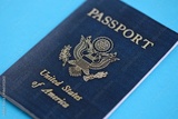 United States passport book on light blue paper background close up. Travel document on blue surface