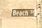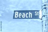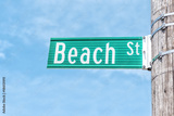 Closeup of Beach street sign attached on pole isolated against blue sky background