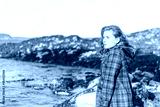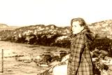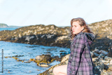 Young woman sitting on beach shore rocky coast in warm coat during sunny summer day in Bar Harbor, Maine on Mount Desert Island