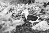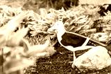 Wooden seagull statue in summer garden sculpture standing in mulch