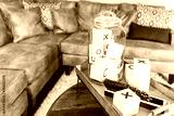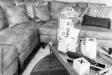 Game room tray stand with x and o, dominoes, on coffee table in staging model house or apartment by brown leather couch
