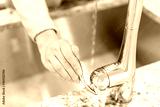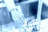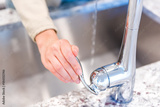 Young woman hand turning on faucet in modern kitchen with granite countertops closeup showing stainless steel luxury sink