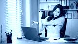 Businesswoman stretching her arm while sitting at a desk in front of a laptop.