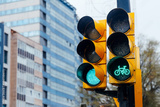Green traffic light signaling safe passage for cyclists, illuminated against a backdrop of modern urban buildings, emphasizing road safety and eco-friendly transportation