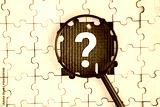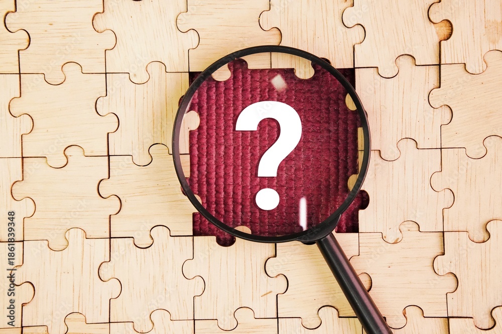 magnifying glass and wooden puzzle with question mark. concept of question or answer. Search or solution concept. symbolizing investigation, validation, inquiry, or seeking truth. research, decision.