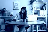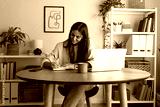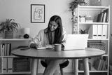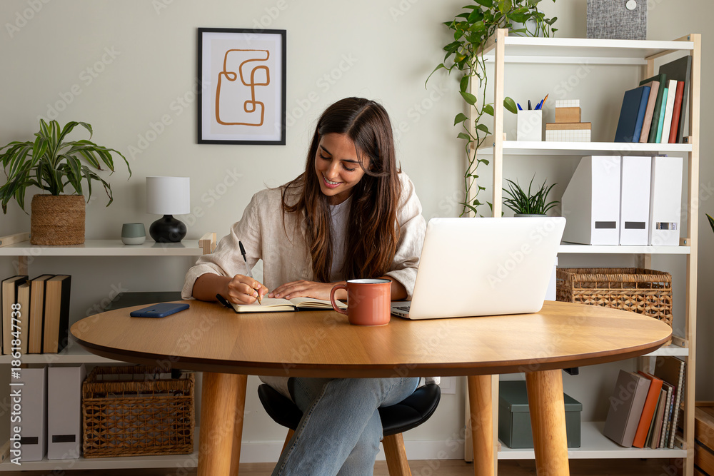 Young happy female caucasian entrepreneur handwriting on a notebook while working at home office