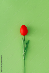 Spring composition with tulip made of red Easter egg on pastel green background. Creative Easter concept. Festive holiday layout. Easter flower aesthetic. Flat lay, top view.