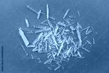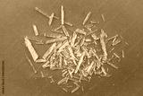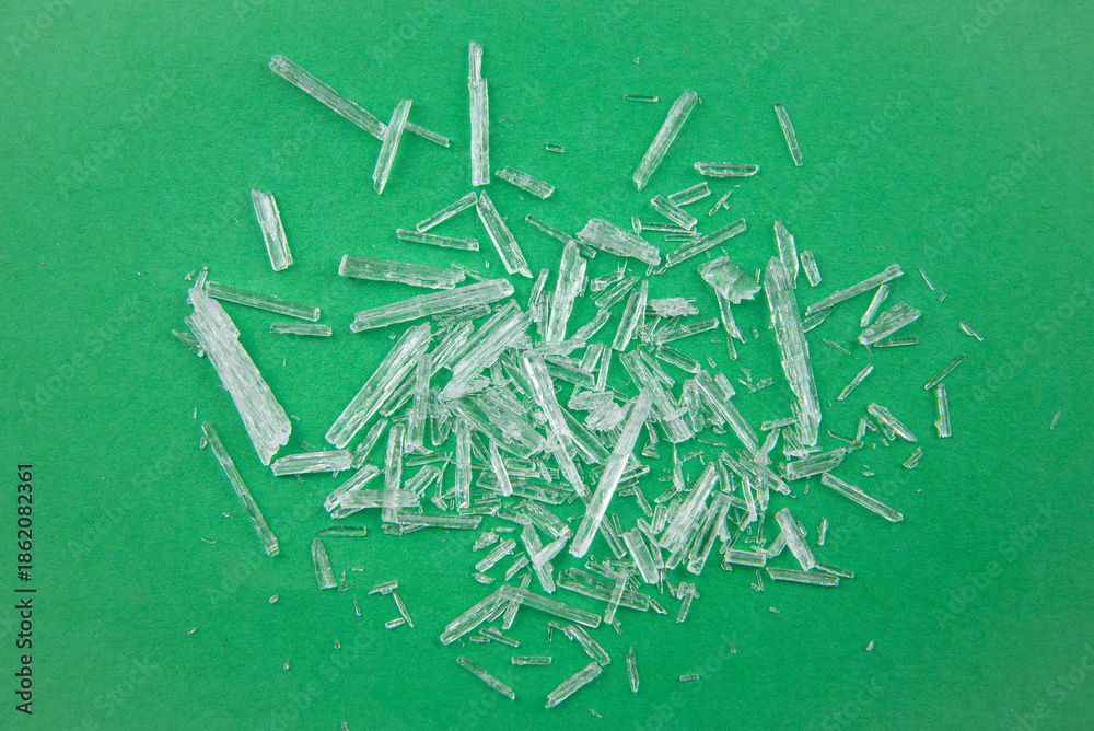 Menthol crystals are a purified, solid form of menthol, white crystalline shards scattered on green background.