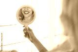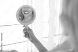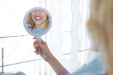 Female patient looking at her beautiful healthy white smile in dental mirror reflection, unrecognizable happy young lady checking results of treatment at modern dentistry, using hand mirror, panorama