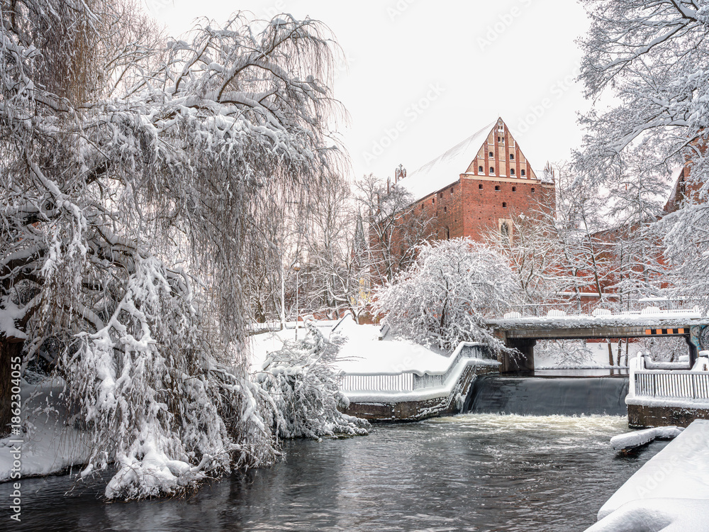 Zima w Olsztynie. Rzeka Łyna. Zamek.