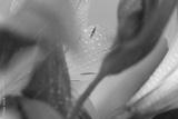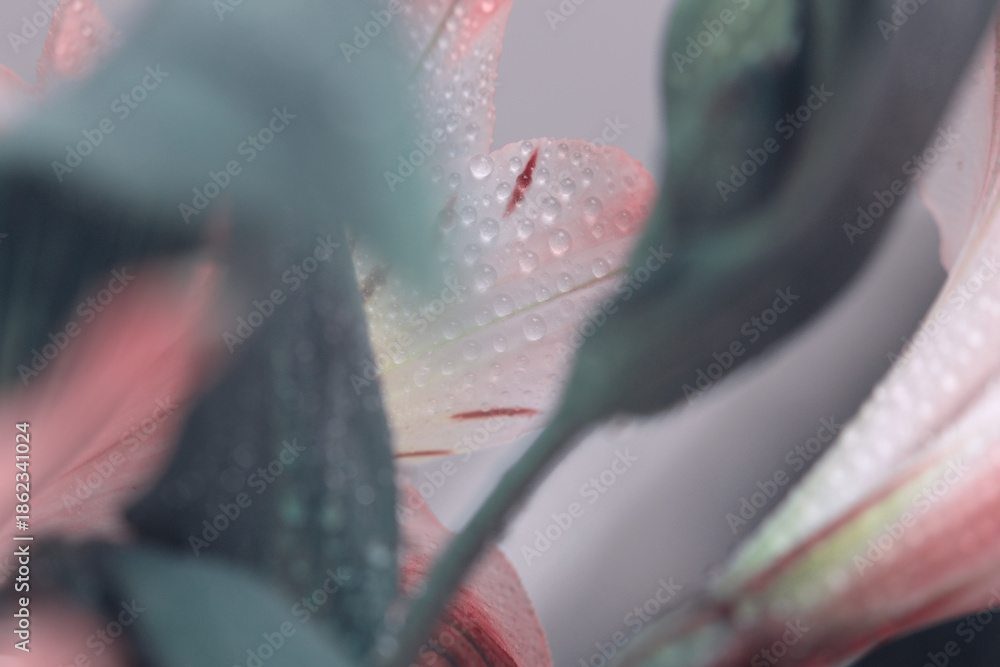 Smoke selective soft focur blurred close-up pink pastel flower, green leaf with water drop. Macro natural background.