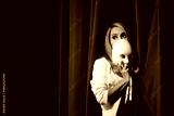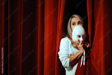 Actress Hiding Behind Curtains and Theatrical Mask. Stressed performer acting emotional and fearful