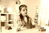 Little girl playing with toys at white table in playroom