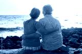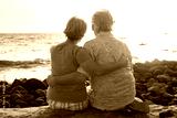 Back view of a bonding senior couple hugging while sitting on a rocky beach face the sea looking at the horizon at sunset light. Retirement lifestyle, vacation, freedom